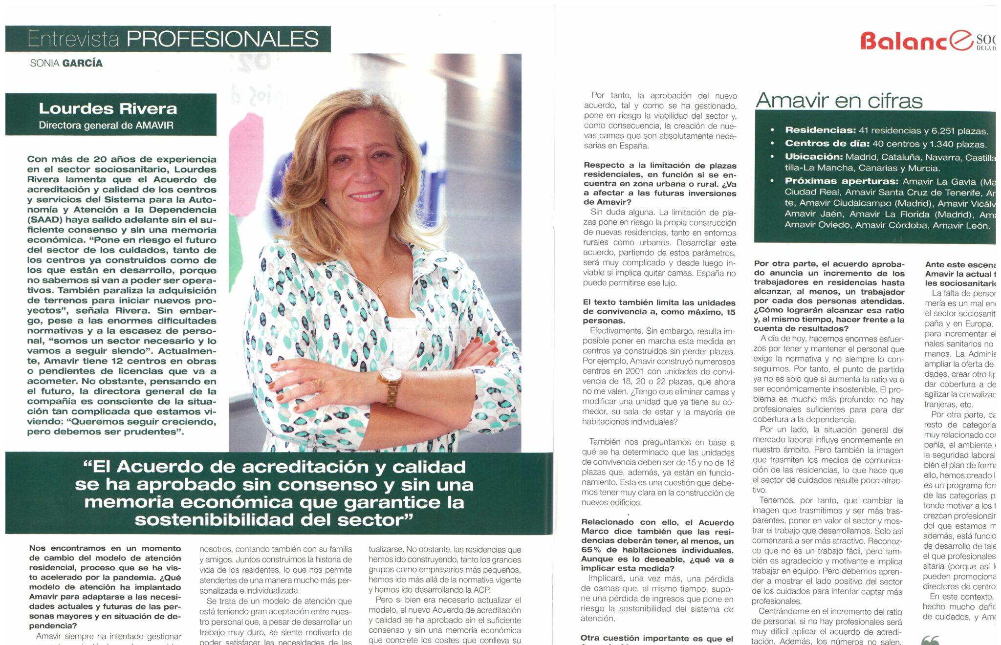 La revista sectorial Balance de la Dependencia incluye en su número de septiembre una entrevista a la Directora General de Amavir y vicepresidenta de AESTE, Lourdes Rivera, en la que pasa revista a la situación de la compañía y del sector.